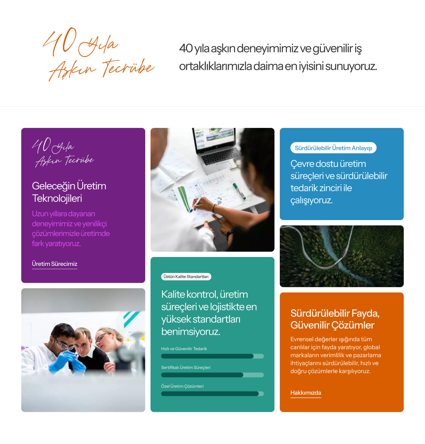 Müşterilerimiz için değer yaratmak, beklentilerine kalite ve istikrarla karşılık vermek ilk önceliğimizdir. Üstün bir maliyet ve kalite dengesi ile hızlı yanıt ve doğru ürün çözümlerini garanti ederiz. |
