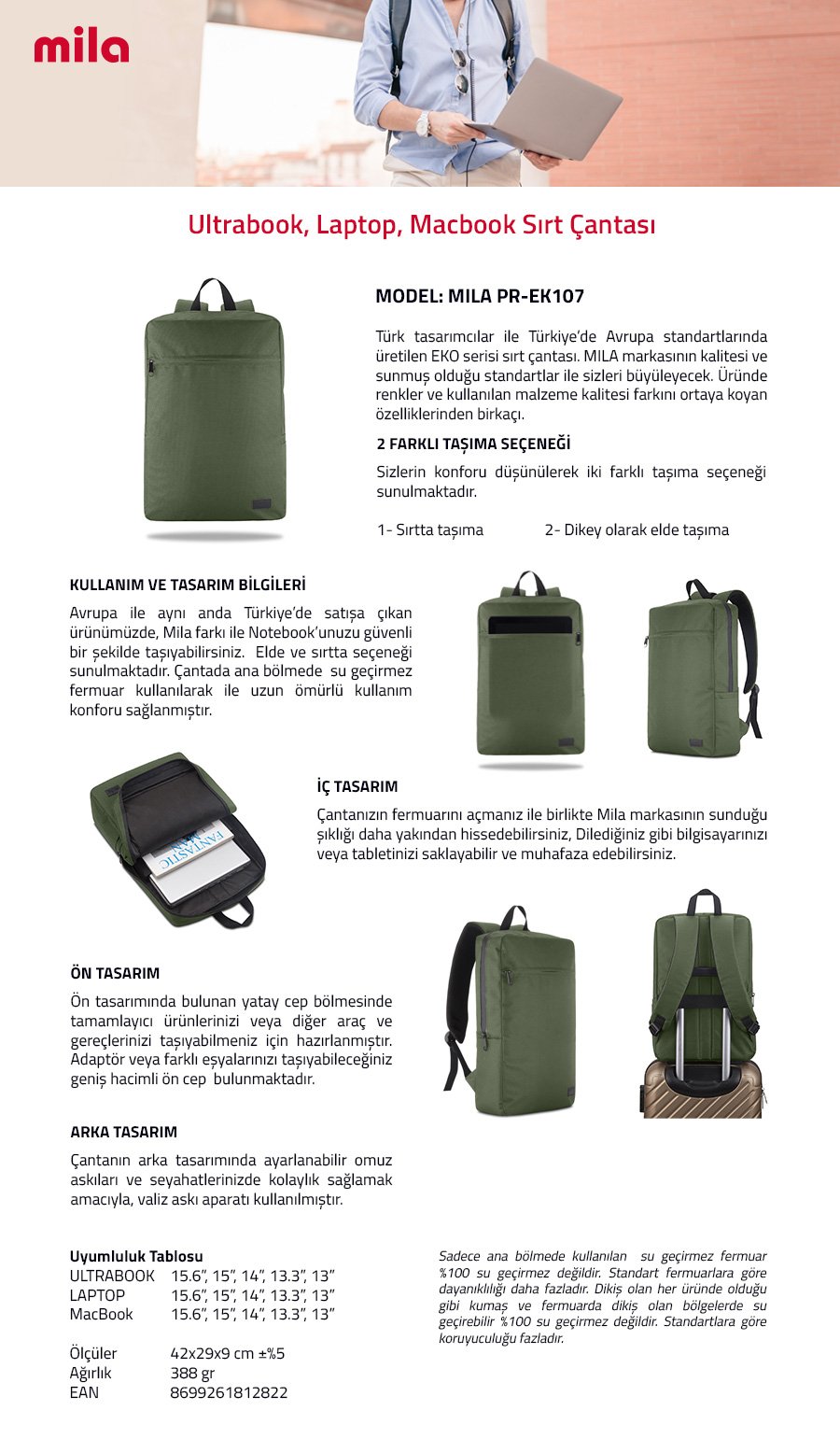 Classone 15.6″ Mila Laptop Sırt Çantası,Lenovo,Hp,Asus,Monster,Macbook,Mac Air Uyumlu – Yeşil