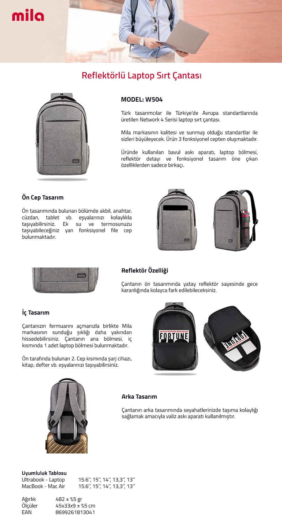 Classone 15.60 inch Mila Serisi Ki3-01-003 Network 4 Serisi – Reflektörlü – Lenovo,Hp,Asus,Monster,Macbook,Mac Air Uyumlu Laptop Sırt Çantası – Gri
