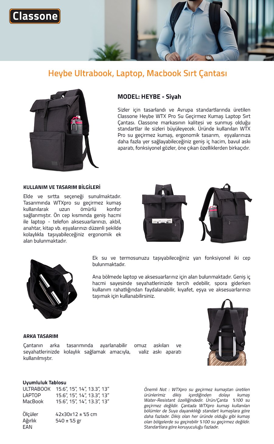 Classone Su geçirmez Kumaş 15.6 inch ,Notebook, Laptop, Macbook Sırt Çantası – Siyah