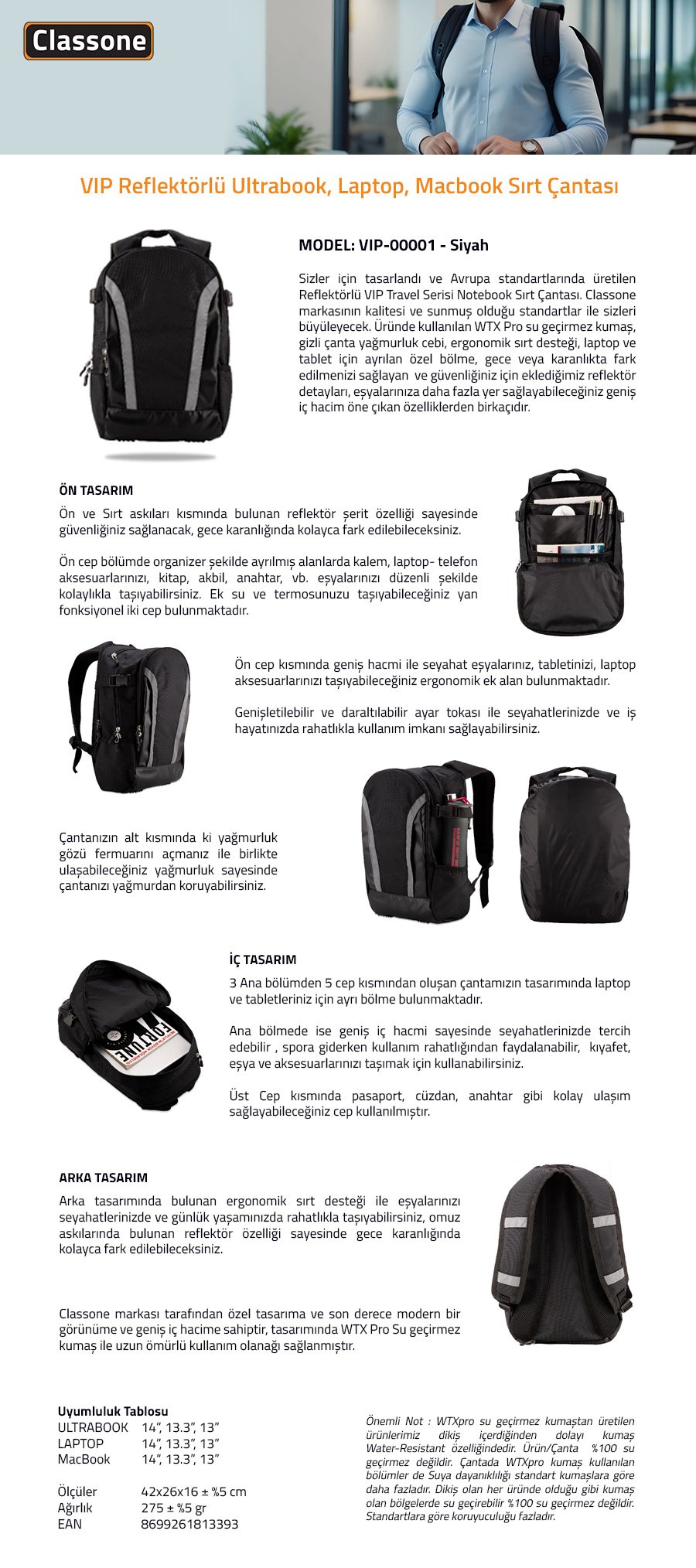 Classone Travel Serisi Reflektörlü 13-14 inch Uyumlu WTX Pro Su Geçirmez Kumaş Laptop, Notebook Sırt Çantası