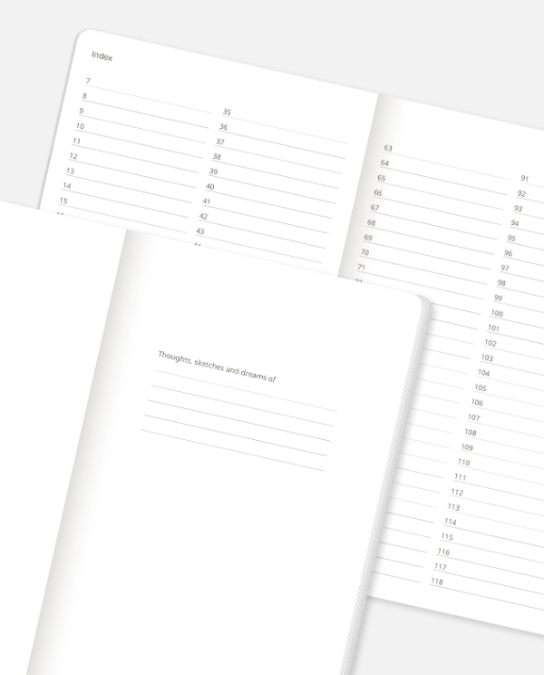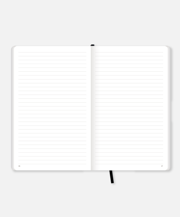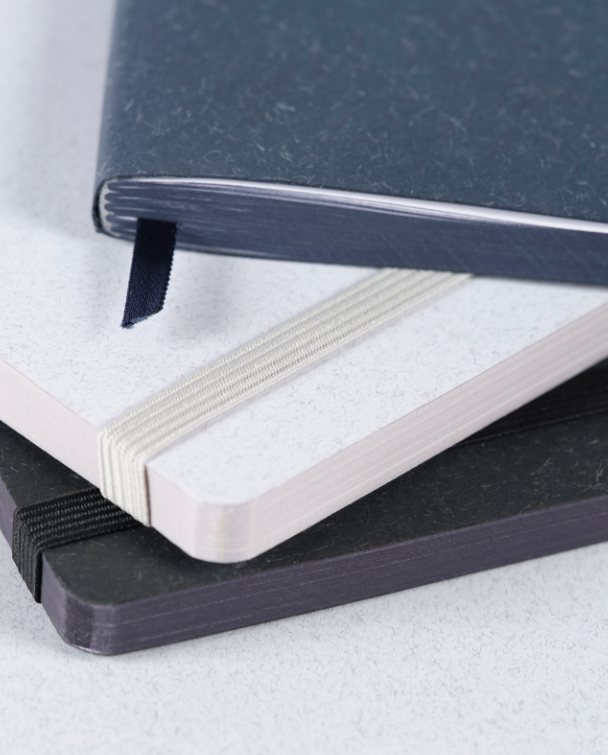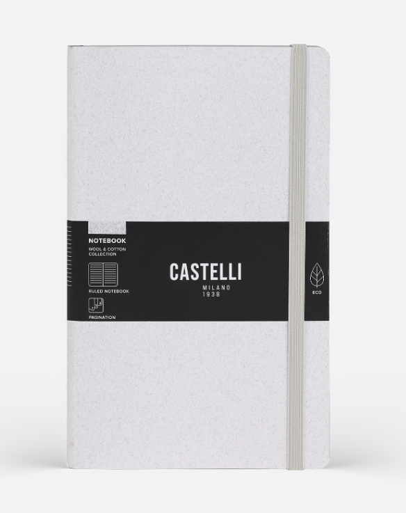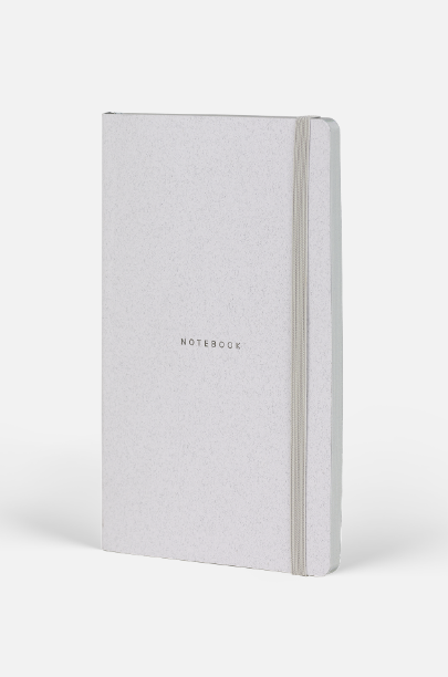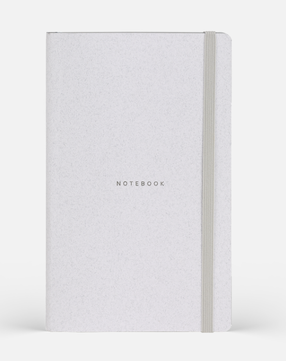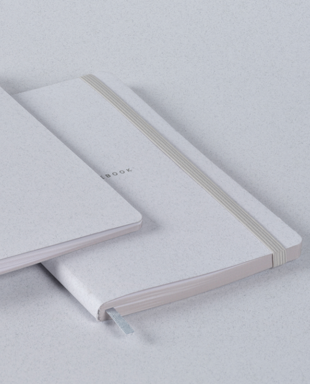 Wool&Cotton koleksiyonundan geri dönüştürülmüş tekstil lifi artıklarından üretilmiş, beyaz esnek ve grenli kapaklı defter ve dikişli defter.